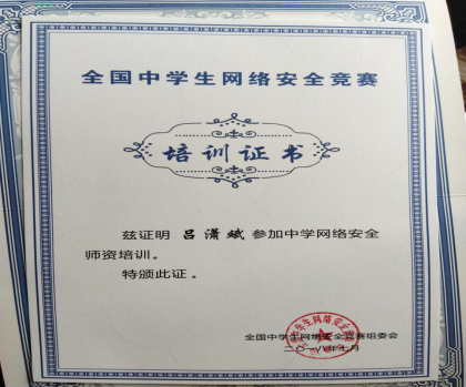社团指导老师吕潇斌荣获 “全国中学生网络安全师资培训” 证书和优秀指导老师证书: