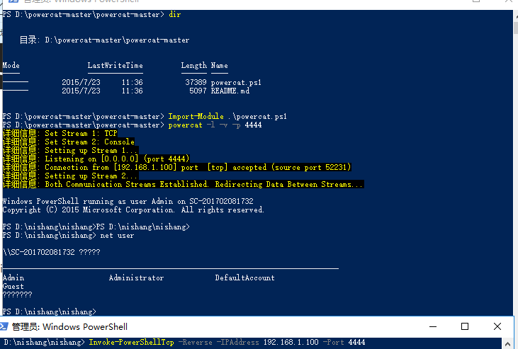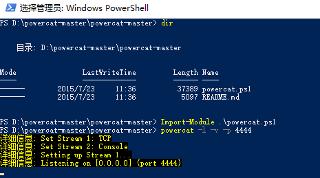 同样,windows 也可以挂载一个监听使用 powercat 即可