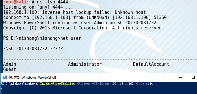 同样在 Powershell 上使用 Invoke-PowerShellTcp 反弹一个 shell 过去