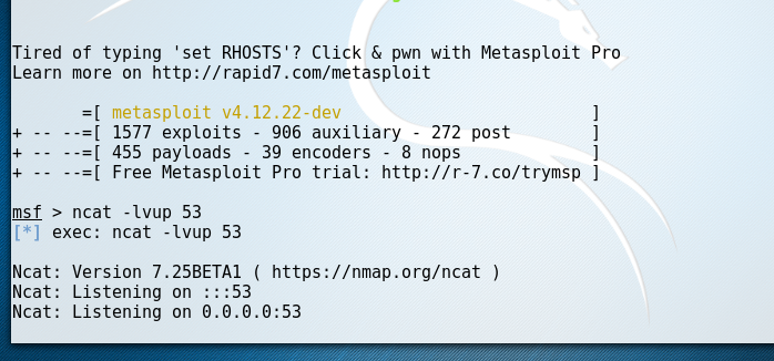 同样我先在 Kali 上启用启用一个监听不过这次用的 ncat