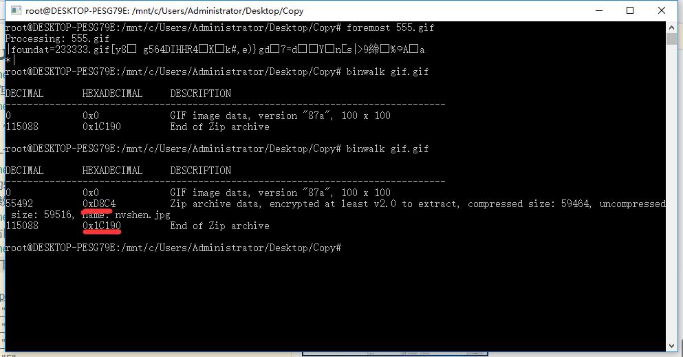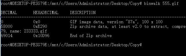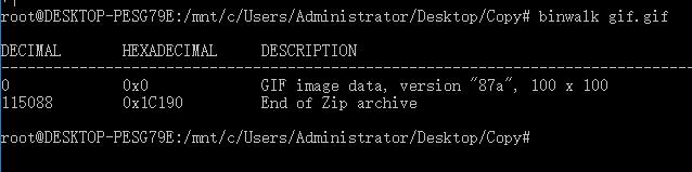 使用Binwalk分析该gif文件,发现其中存在zip文件痕迹,但缺少zip文件的头部数据: