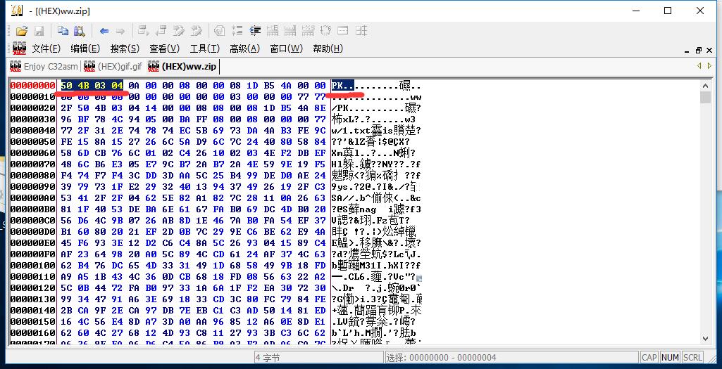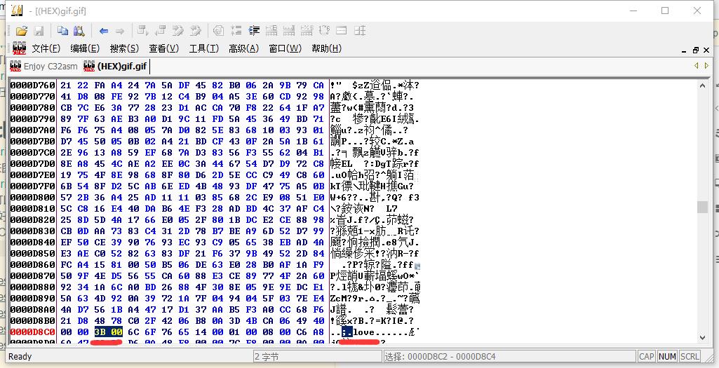 查阅资料可知,GIF文件的结束标识为3B 00,因此使用C32ASM(或其他十六进制编辑器)打开文件,查找GIF的结束位置: