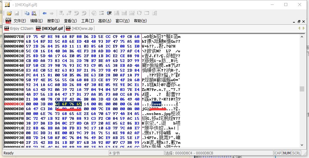 观察到文件中的 “Love” 字符串可用于填充ZIP头部缺失的数据,直接在十六进制编辑器中替换对应内容: