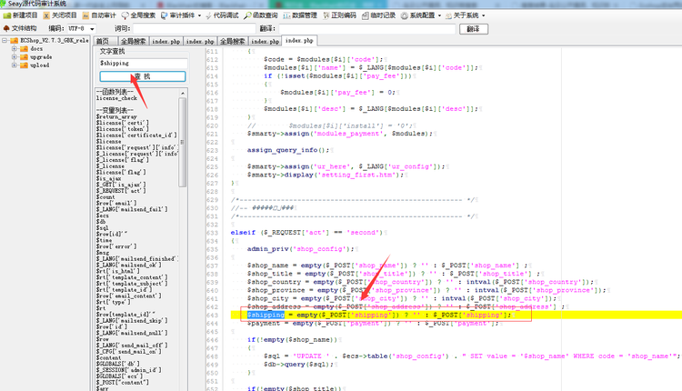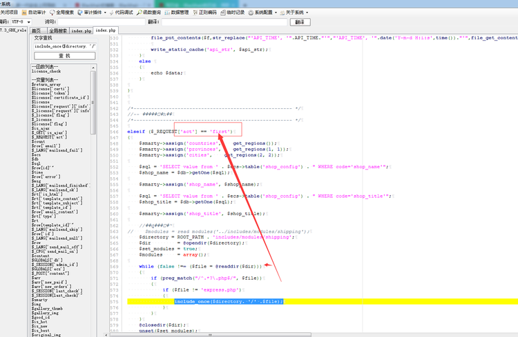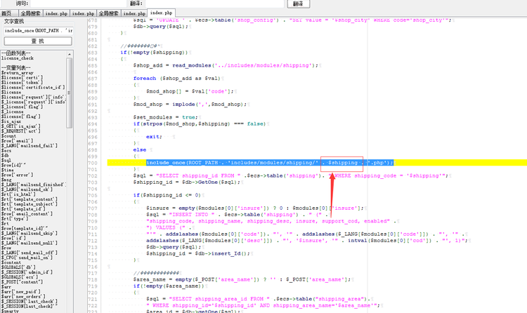关键代码:$directory = ROOT_PATH . 'includes/modules/shipping';,结合上下文判断,变量$file可控,无有效过滤。