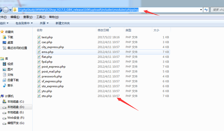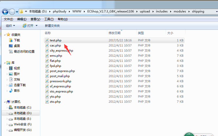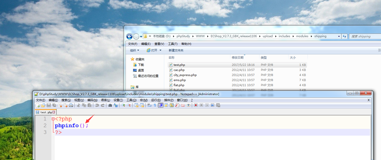 进入includes/modules/shipping目录,新建test.php文件,写入phpinfo()代码: