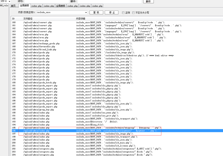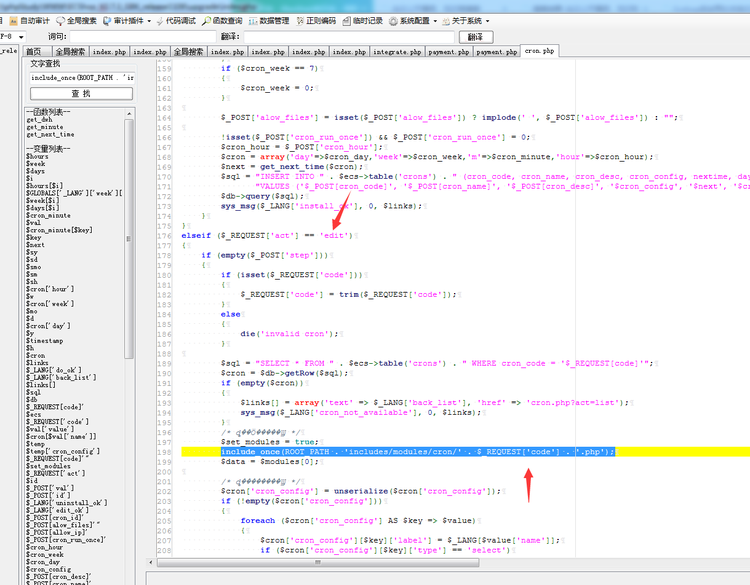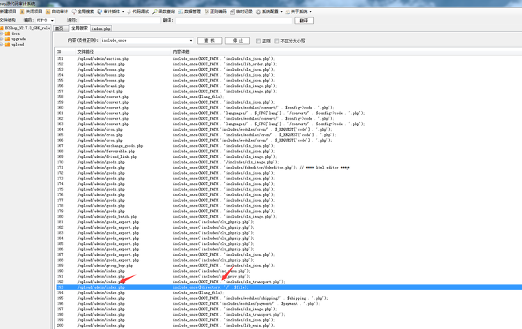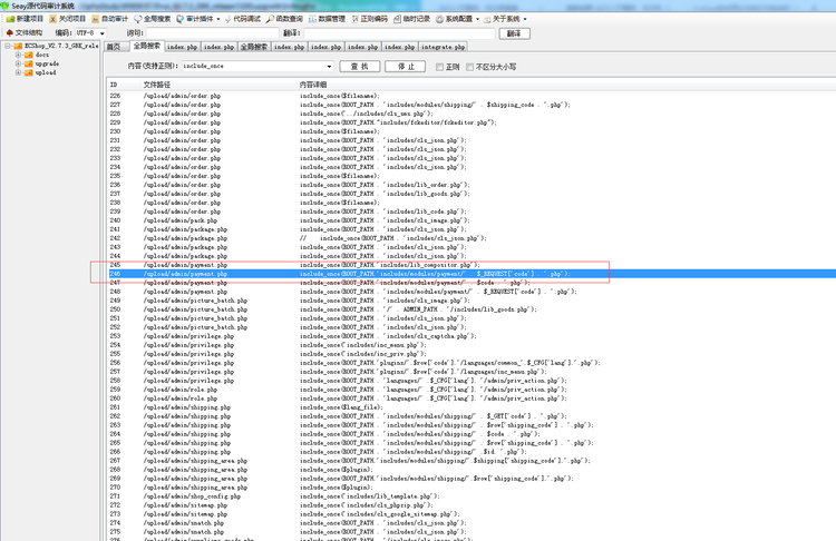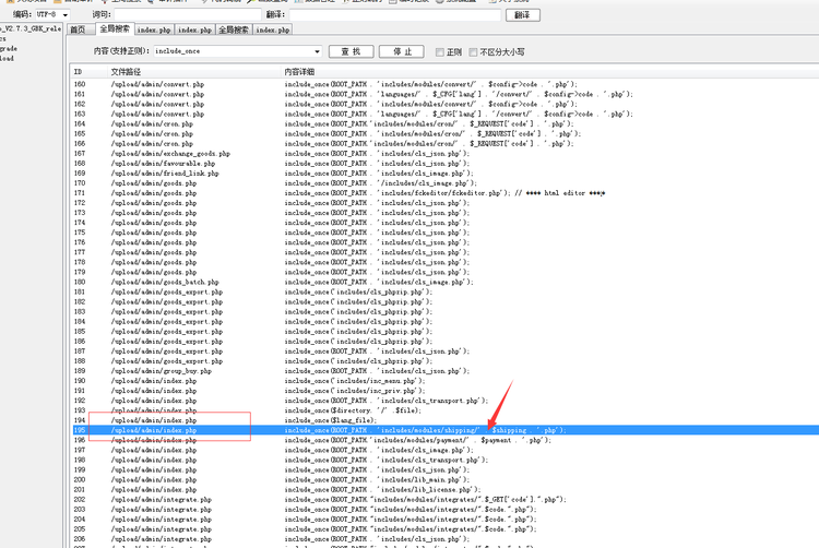 以include_once为关键字在 CMS 源码中搜索,发现大量相关调用,其中一处可疑代码位置如下: