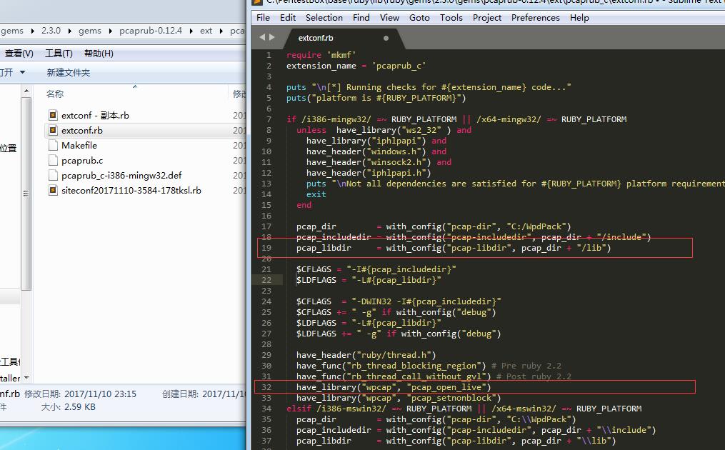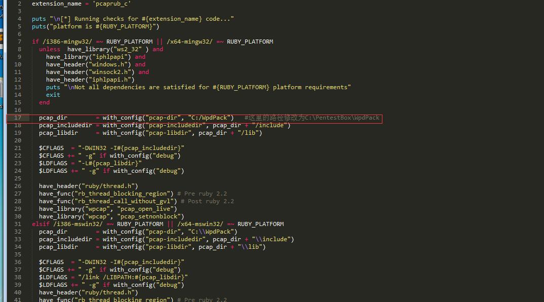 打开路径C:\PentestBox\base\ruby\lib\ruby\gems\2.3.0\gems\pcaprub-0.12.4\ext\pcaprub_c下的extconf.rb文件,在pcap_libdir和have_library之间添加以下代码:
