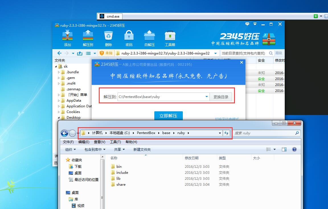 解压新 Ruby 包:将下载的ruby-2.3.3-i386-mingw32.7z解压到上述路径。