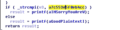 将程序拖入 IDA,通过字符串定位找到关键函数strcmp(用于校验解密后的 Flag 与正确值是否一致)。