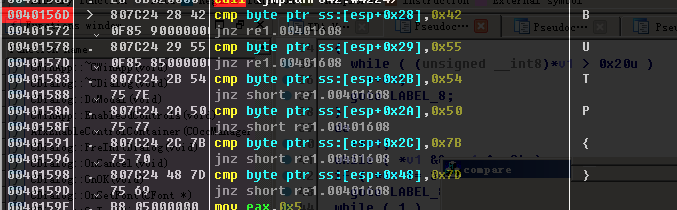 调试发现程序检测0x42, 0x55等十六进制值,转换为 ASCII 后可知: