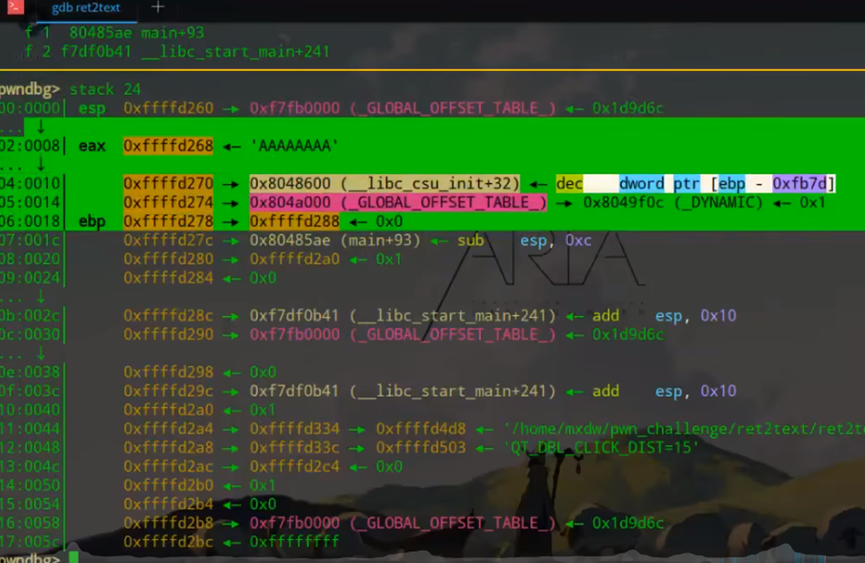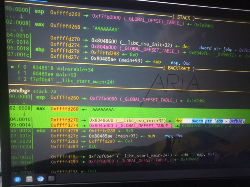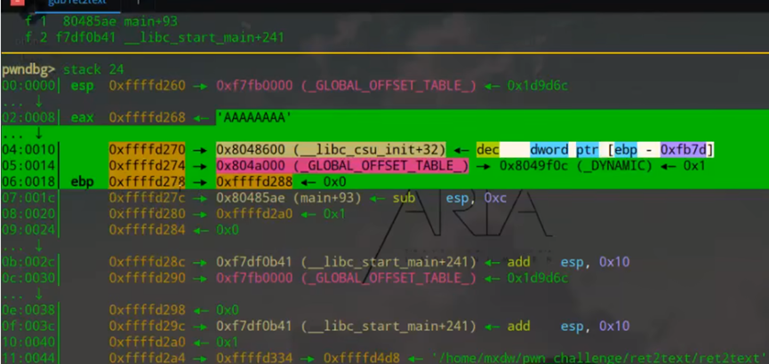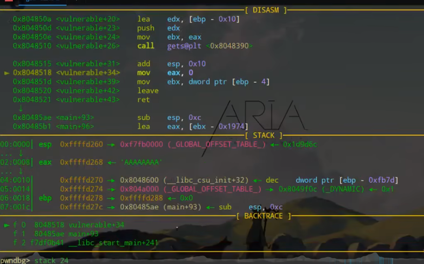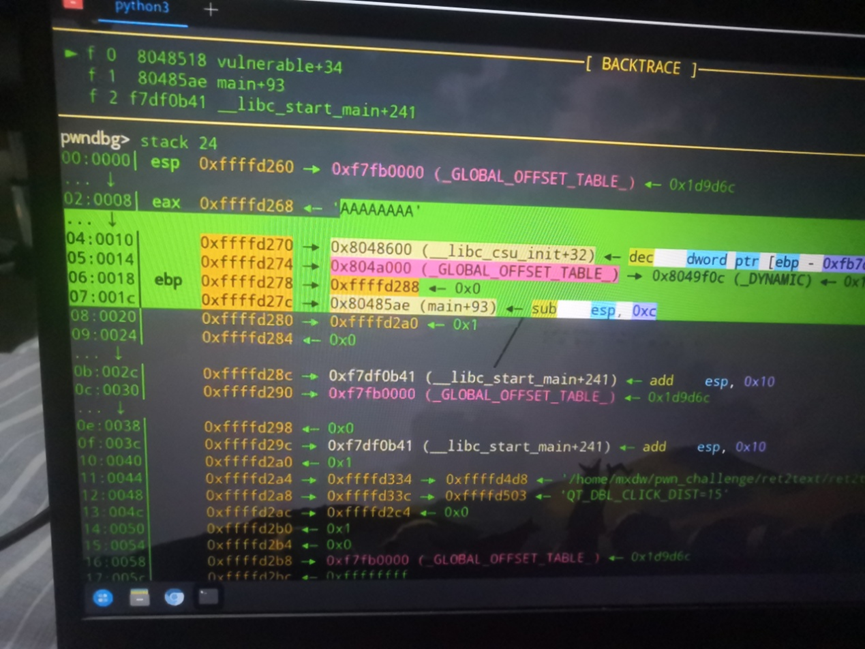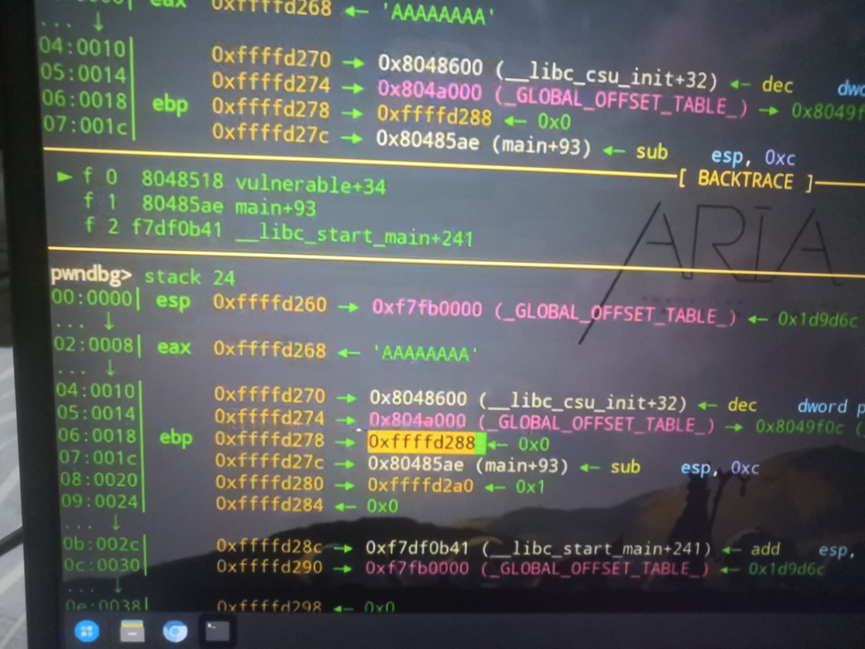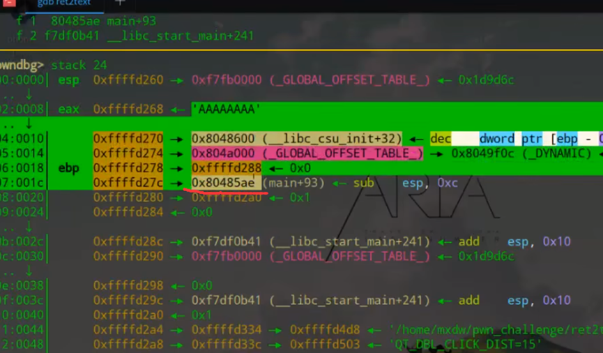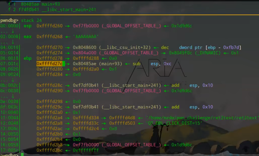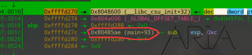 返回地址:EBP 下方(内存地址更高)的 4 字节数据,即函数执行完后要跳转的地址(本题中vulnerable函数默认返回main+93地址);