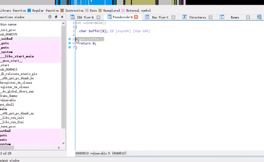 漏洞定位:静态逆向(IDA)找危险函数(gets)和后门函数(getshell);