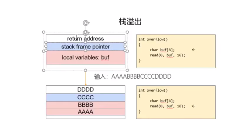 危险函数:使用gets()函数读取输入,gets()无输入长度限制,可导致栈溢出(超过变量缓冲区 8 字节的部分会覆盖栈上的其他数据,包括返回地址)。