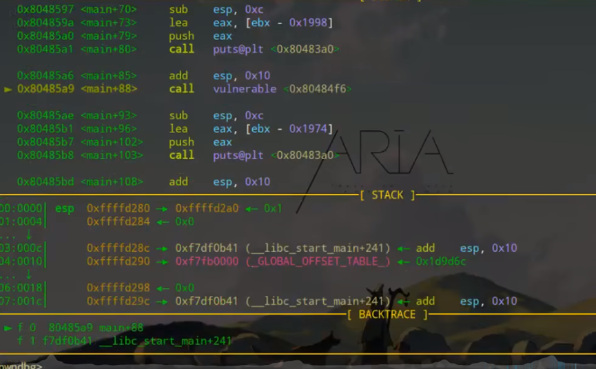 用n(next)命令单步执行 main 函数,直至调用vulnerable函数;