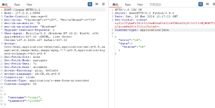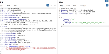 Cookie: character=admin;token=eyJ1c2VybmFtZSI6ICJ4aW55aSIsICJwYXNzd29yZCI6ICIxMjM0NTYiLCAicm9sZSI6ICJhZG1pbiJ9=