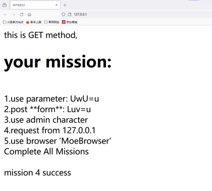 打开题目后,要求如下:1. 用 GET 传参;2. 用 POST 传参;3. 直接将 Cookie 的character改成admin